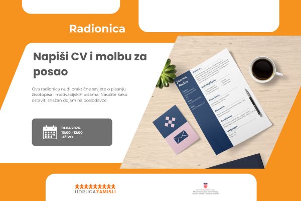 U srijedu 01. travnja 2026. od 10:00 - 12:00 održat će se radionica pod nazivom “Napiši CV i molbu”. Radionica se održava isključivo uživo na adresi: Braće Cvijića 5. (Knežija). Ova radionica pružit će vam korisne savjete i tehnike kako biste poboljšali svoje vještine u pisanju životopisa i molbi te istaknuli svoje kvalifikacije na najbolji mogući način.